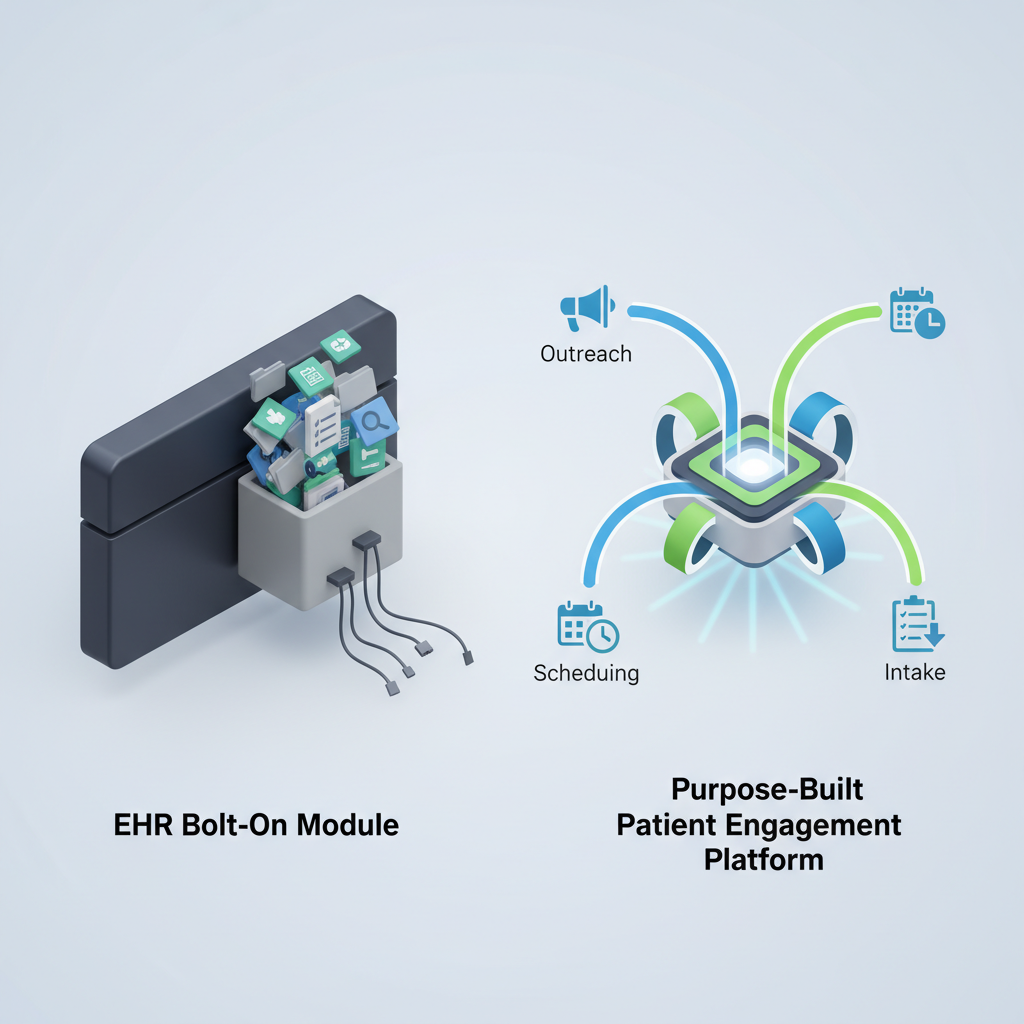 But not all patient engagement software is the same. There is a meaningful difference between bolt-on engagement modules that live inside an EHR and purpose-built patient engagement platforms designed from the ground up to serve that specific function. Understanding that difference is what helps healthcare organizations make the right investment.